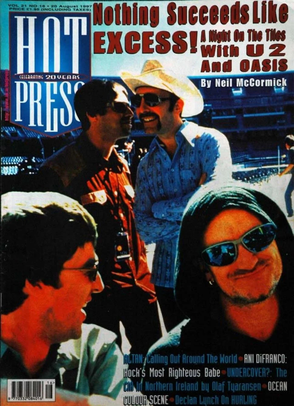 CUANDO ‘LA MEJOR BANDA DEL MUNDO Y LA SIGUIENTE MEJOR BANDA DEL MUNDO’ – PALABRAS DE NOEL – SE ENCONTRARON EN SAN FRANCISCO DURANTE LA GIRA DEL POP MART, NEIL McCORMICK ESTABA ALLÍ PARA VER LOS FUEGOS ARTIFICIALES Y HABLAR CON LOS PROTAGONISTAS PRINCIPALES SOBRE POR QUÉ SE AGRADAN TANTO. EN EL CAMINO INCLUSO CONSIGUE QUE BONO LE EXPLIQUE DE QUÉ SE TRATA EL POPMART… MÁS O MENOS.